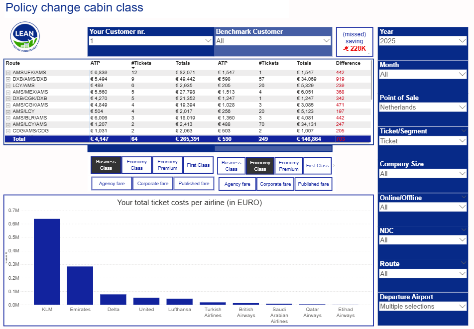 What would it save if you switched from business class to premium or economy on certain routes? We simulate these policy shifts using actual fares from the market — just a few clicks and the impact becomes crystal clear.