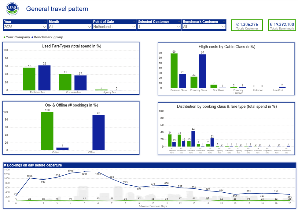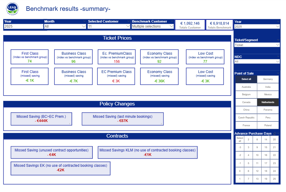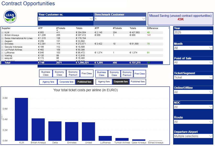 Our benchmark dashboard compares your non-contracted spend with contracted fares from our benchmark group — same airline, same route, same fare basis. It’s a razor-sharp analysis that instantly reveals where you're missing out on potential airline deals.