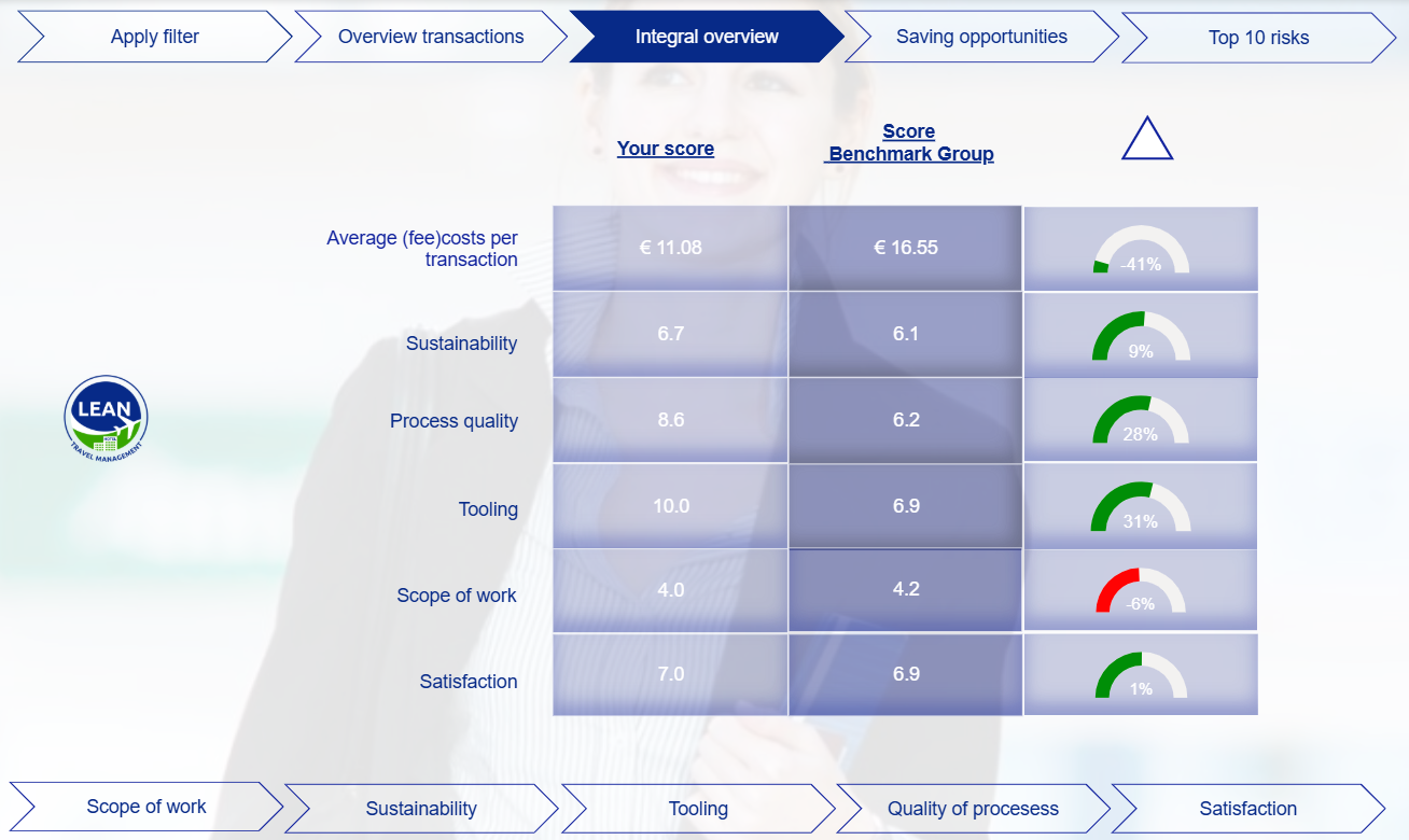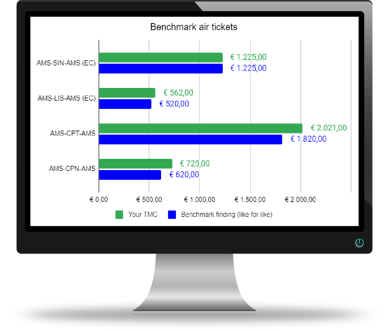 Complete transparency into the cost-performance ratio of your travel agency's (TMC) services through a questionnaire. Your prices and scores are benchmarked against peers. A superb foundation for effortless optimization and strategic direction